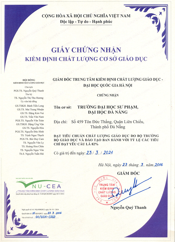 Giấy chứng nhận số 01/GCN-CSGD công nhận Trường ĐH Sư phạm - ĐHĐN đạt tiêu chuẩn chất lượng giáo dục